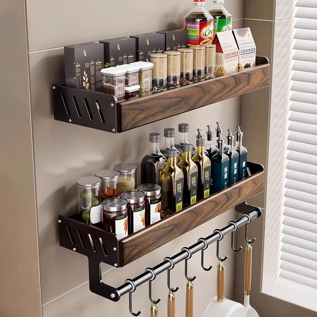 Vägghängd kryddhylla i valnöt och kolstål (borrfri)